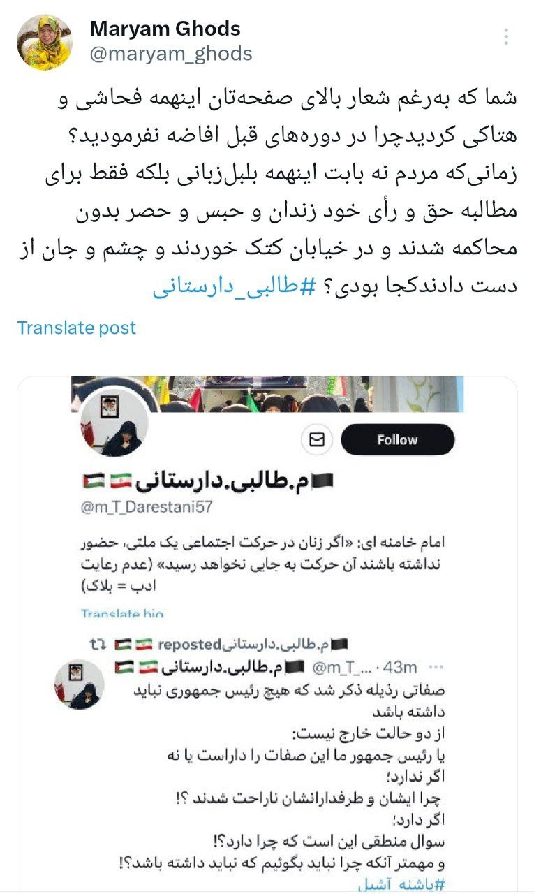 🔹شما که بهرغم شعار بالای صفحهتان این همه فحاشی و هتاکی کردید، چرا در دورههای قبل افاضه نفرمودید؟ زمانیکه مردم نه بابت این همه بلبلزبانی بلکه فقط برای مطالبه حق و رأی خود زندان و حبس و حصر بدون محاکمه شدند و در خیابان کتک خوردند و چشم و جان از دست دادند، کجا بودی؟