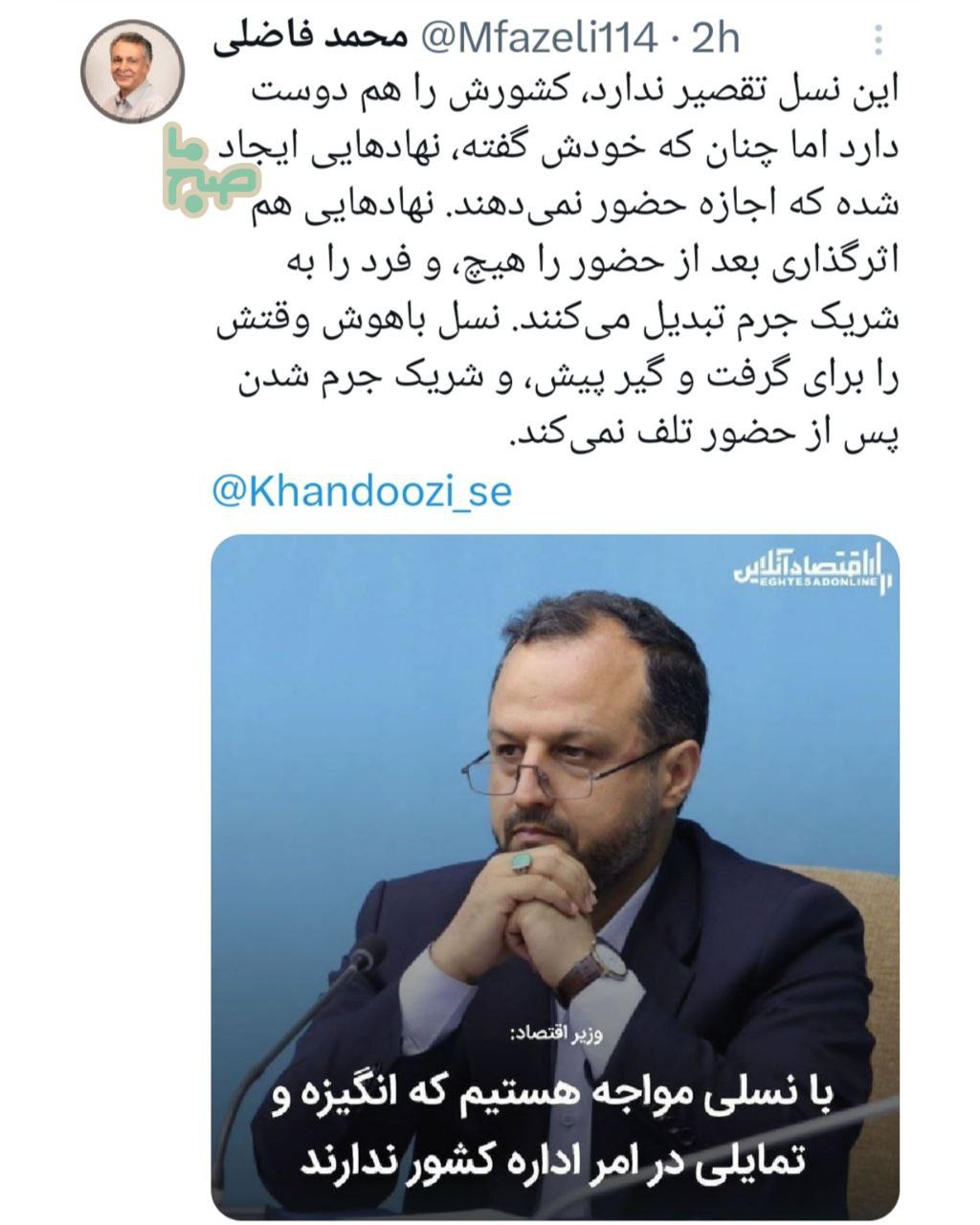 واکنش محمد فاضلی به اظهارات وزیر اقتصاد دولت رئیسی: این نسل تقصیر ندارد، کشورش را هم دوست دارد اما چنان که خودش گفته، نهادهایی ایجاد شده که اجازه حضور نمیدهند