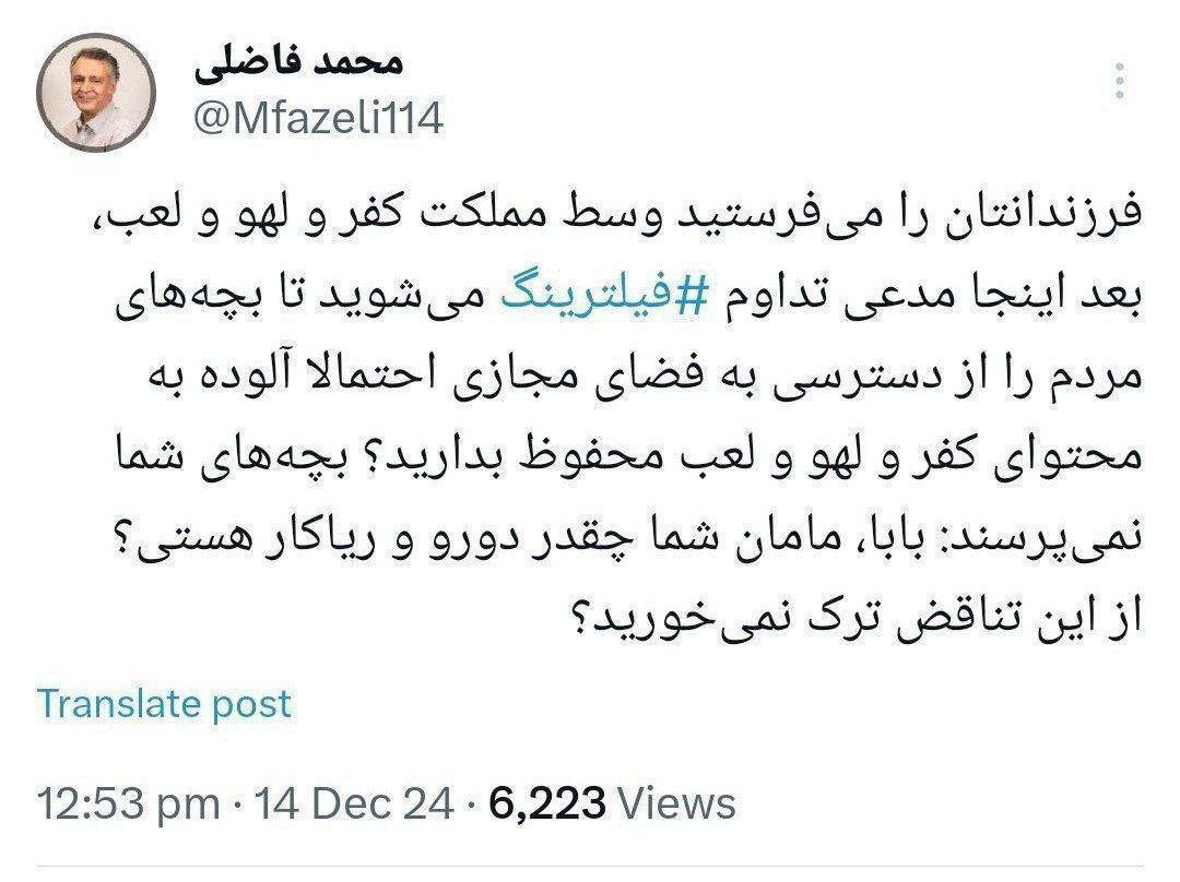 واکنش محمد فاضلی به برخی حامیان فیلترینگ که فرزندان شان در اروپا اقامت دارند: