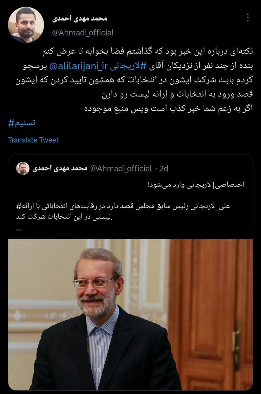 واکنش محمد مهدی احمدی خبرنگار پارلمانی نسبت به تکذیبیه دفتر علی لاریجانی