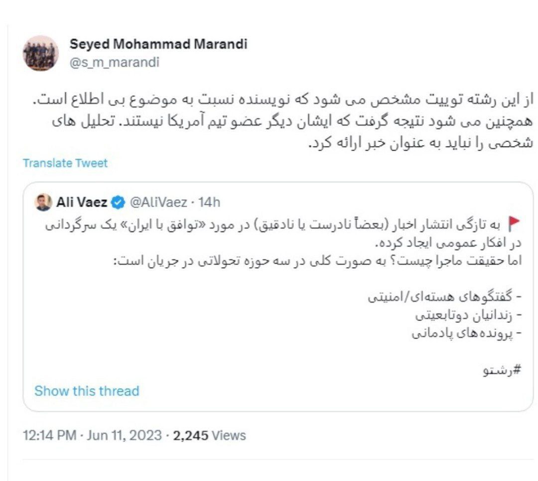 🔹تحلیلگر مسائل بینالملل در واکنش به ادعاهای علی واعظ، مدیر پروژه ایران در «گروه بینالمللی بحران» درباره توافق موقت بین ایران و آمریکا نوشت: از این رشته توئیت مشخص میشود که نویسنده نسبت به موضوع بی اطلاع است.