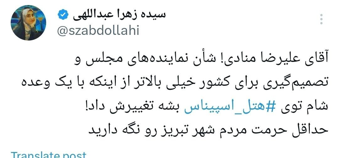 زهرا عبداللهی در واکنش به حواشی این روزهای مجلس، در شبکه اجتماعی ایکس نوشت: آقای علیرضا منادی! شأن نمایندههای مجلس و تصمیمگیری برای کشور خیلی بالاتر از اینکه با یک وعده شام توی هتل اسپیناس بشه تغییرش داد!
