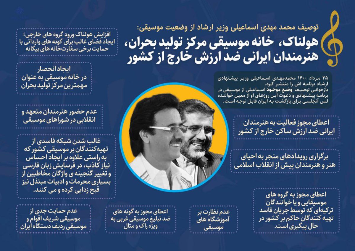 🔹این روزها که اسماعیلی وزیر ارشاد دولت خیلی خیلی قوی آقای رئیسی از بازگشت معین خواننده لسآنجلسی به ایران سخن گفته؛ در برنامه پیشنهادی اش در توصیف وضع موجود موسیقی نوشته بود به هنرمندان ایرانی ضدارزش خارج از کشور مجوز داده و موجب احیای هنر و هنرمندان پیش از انقلاب شدهاند!
