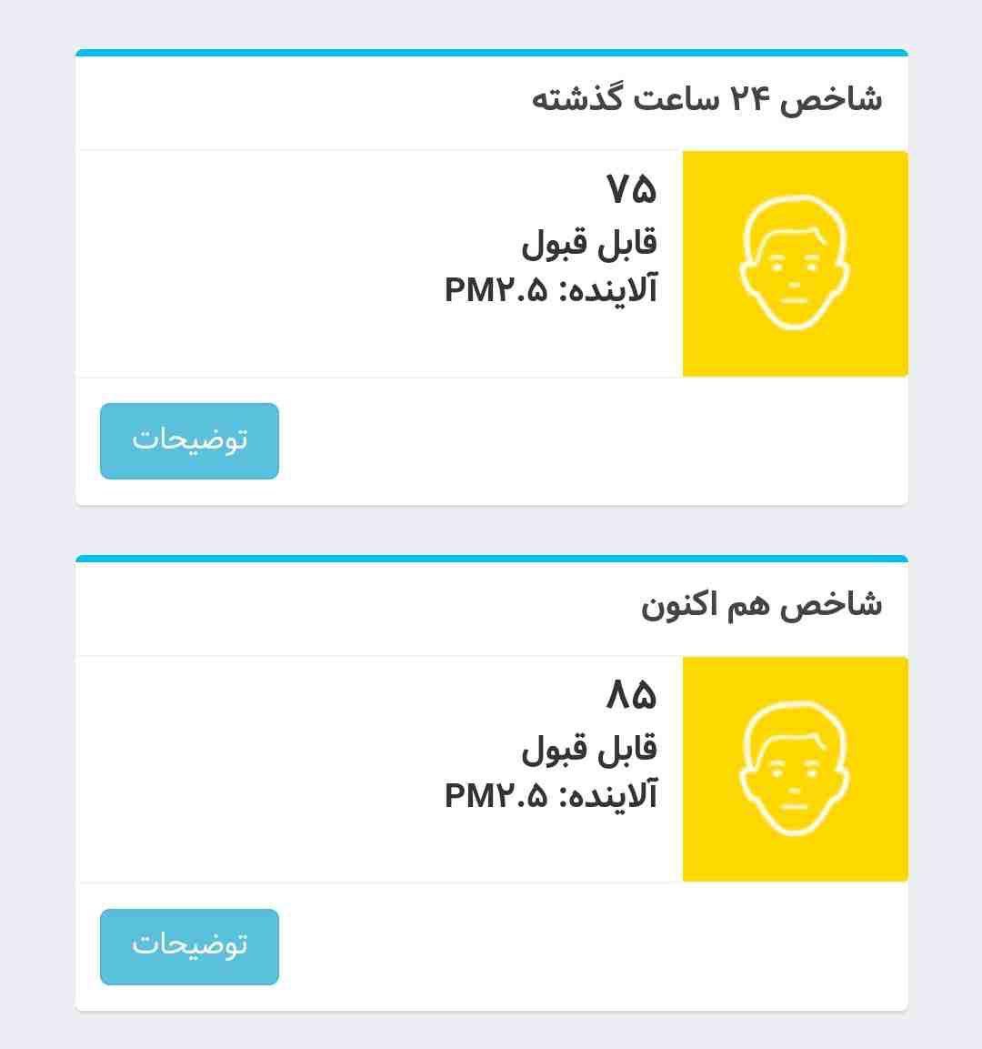 🔹 بر اساس اعلام شرکت کنترل کیفیت هوای تهران، شاخص کیفیت هوا در حال حاضر بر روی عدد ۸۵ قرار گرفته و وضعیت هوا قابل قبول اعلام شده است.