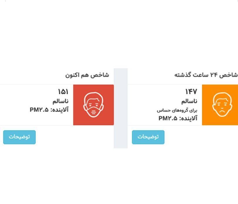 🔹آلودگی هوای تهران با شاخص ۱۵۱ هم اکنون در وضعیت قرمز و ناسالم برای همه افراد قرار دارد.