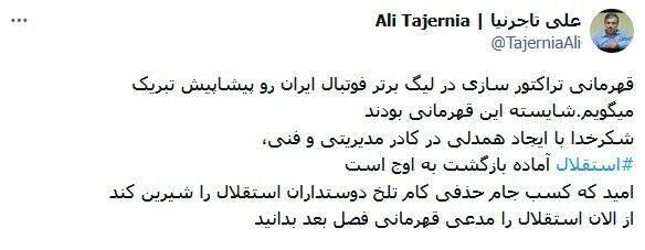 تاجرنیا در متن پیام خود نوشت: «قهرمانی تراکتور سازی در لیگ برتر فوتبال ایران رو پیشاپیش تبریک میگویم. شایسته این قهرمانی بودند