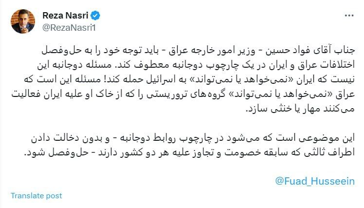 پاسخ رضا نصری به اظهارات توهین آمیز وزیر خارجه عراق نسبت به ایران