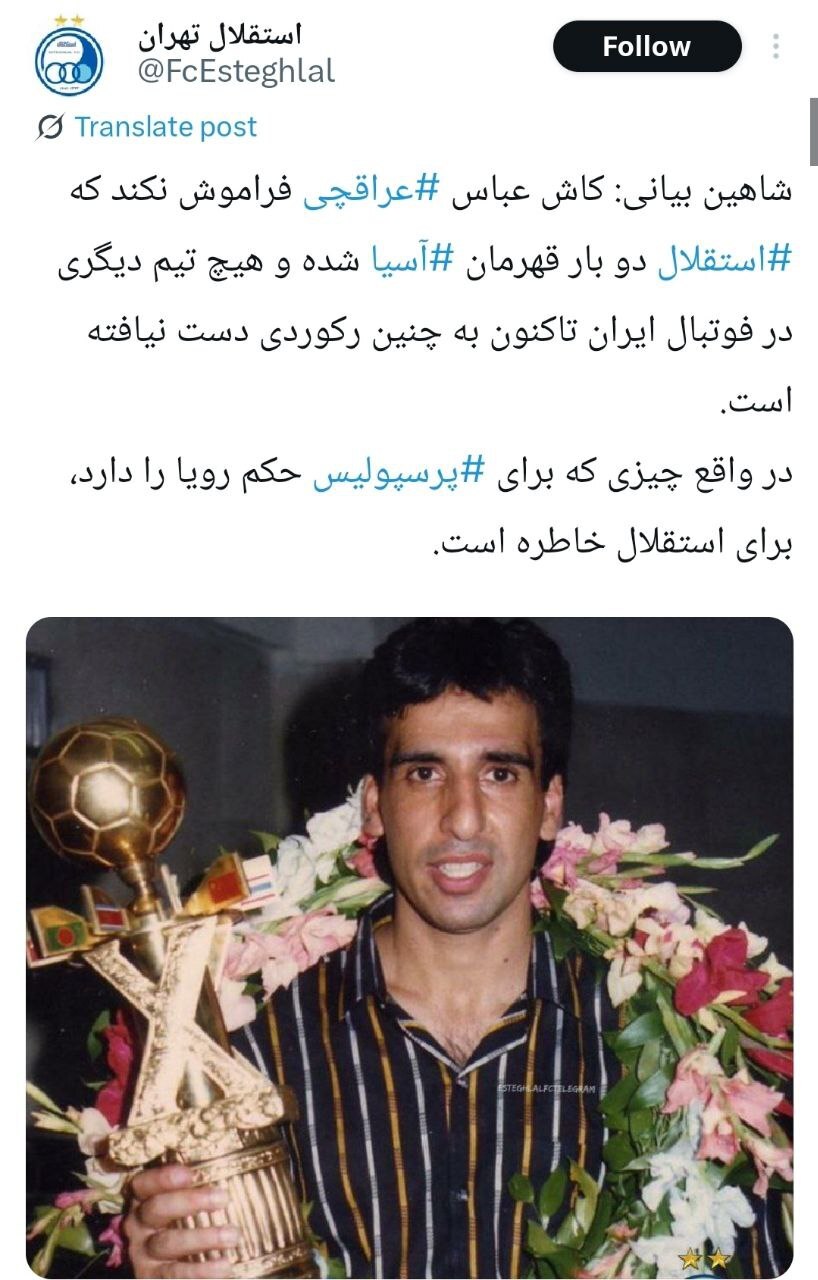 شاهین بیانی: کاش عباس عراقچی فراموش نکند که استقلال دو بار قهرمان آسیا شده و هیچ تیم دیگری در فوتبال ایران تاکنون به چنین رکوردی دست نیافته است.