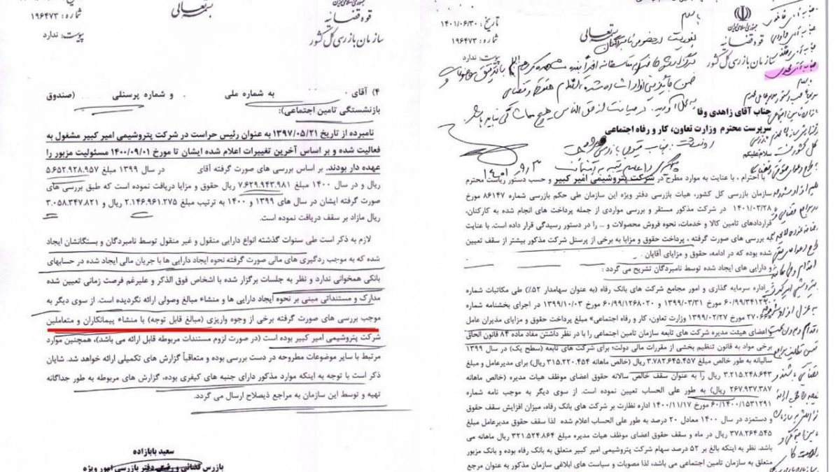 🔹در سال ۱۴۰۰ طبق اسنادی که در فضای مجازی منتشر شد ۳ تن از مدیران پتروشیمی امیرکبیر « ف – ر»، مدیر مالی ۲۱۵ میلیون تومان. « ع – ج»، مدیر منابع انسانی ۱۲۵ میلیون تومان و « ح – الف» رئیسحراست (کسی که وظیفهاش گزارش پلشتیها به مقامات مسئول است) ۸۴ میلیون تومان دریافتی داشتند
