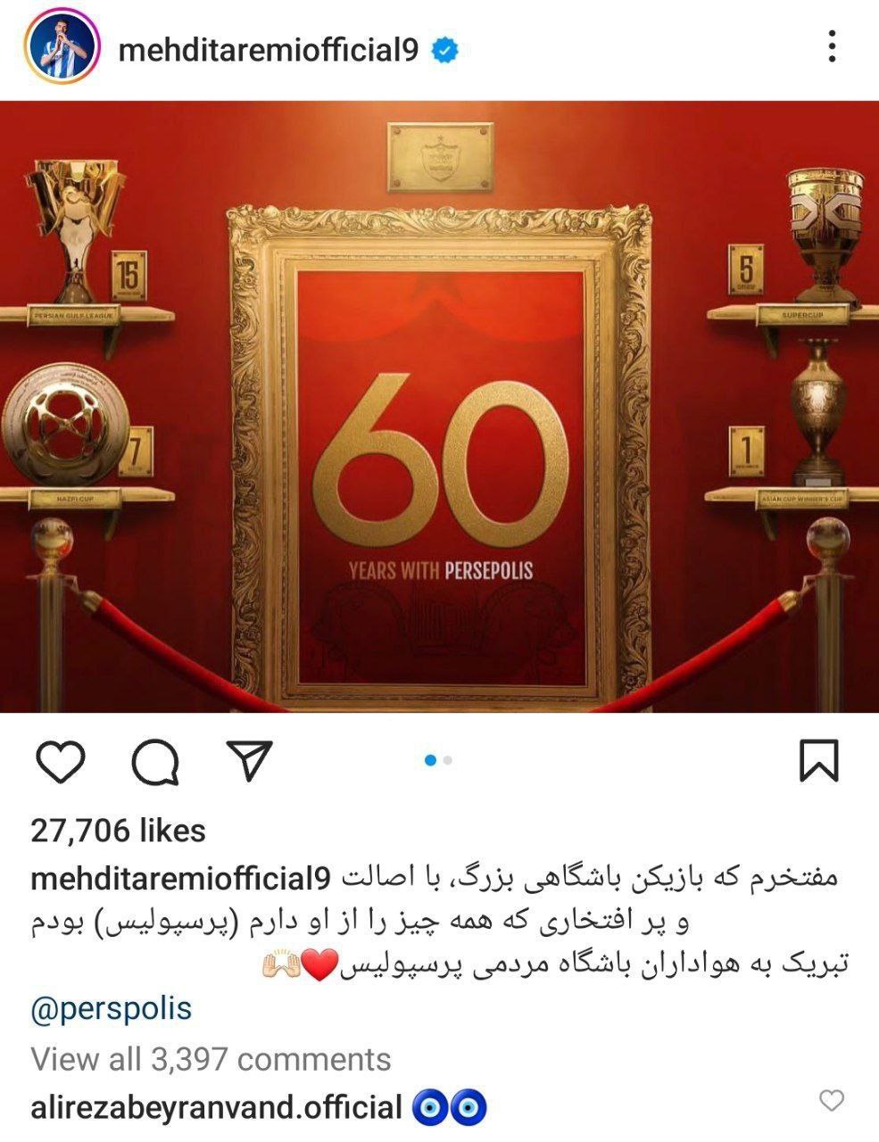 پست اینستاگرامی مهدی طارمی: همه چیز را از پرسپولیس دارم