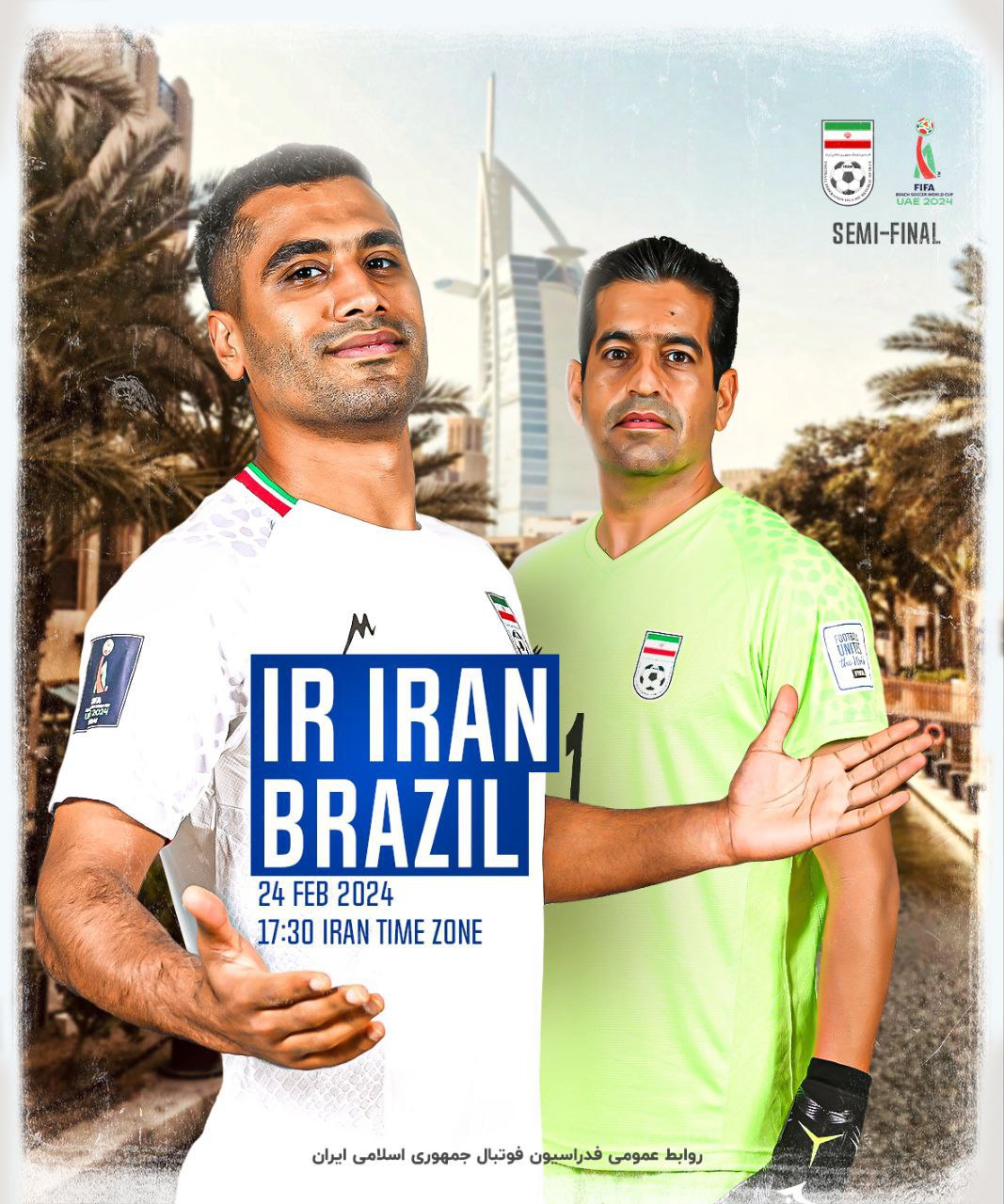 پوستر فدراسیون فوتبال برای بازی تیم ملی ساحلی ایران مقابل برزیل در نیمه نهایی جام جهانی