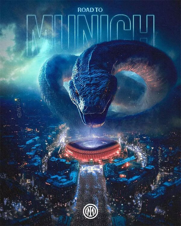 در این پوستر، یک افعی غولپیکر آبیرنگ که نماد سنتی باشگاه اینتر است، در آسمان تیرهشده شهر نمایان است و با چشمانی درخشان، نگاهی تهدیدآمیز به پایین دارد؛ جاییکه هزاران نفر زیر پرچمهای سیاه و آبی اینتر صف کشیدهاند. این تصویر نمادین، علاوه بر نمایش قدرت و عظمت اینتر، به نوعی یادآور تاریخچه پرافتخار این باشگاه در رقابتهای اروپایی است. افعی، که در فرهنگ باشگاه اینتر به عنوان نماد قدرت و استقامت شناخته میشود، در این پوستر به شکلی برجسته به تصویر کشیده شده است.