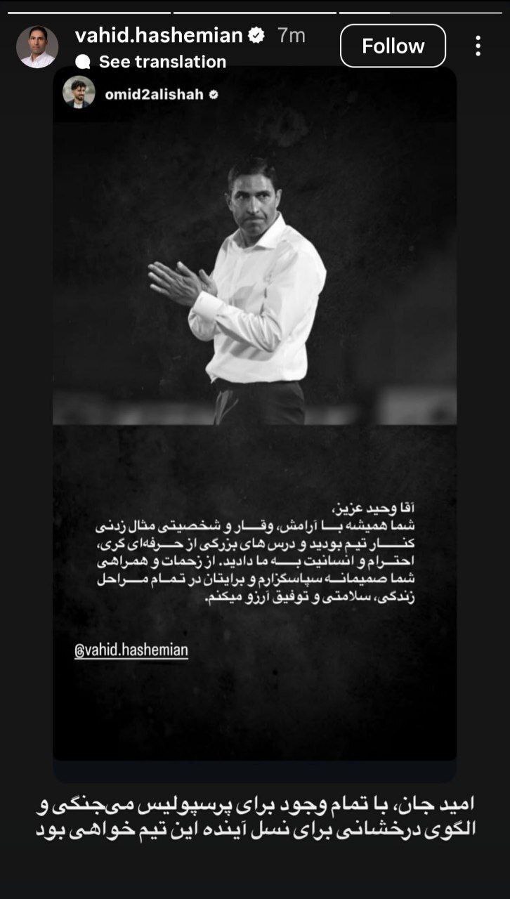 پیام امید عالیشاه خطاب به وحید هاشمیان که با واکنش سرمربی سابق پرسپولیس همراه شد. هاشمیان در جواب استوری عالیشاه نوشت: