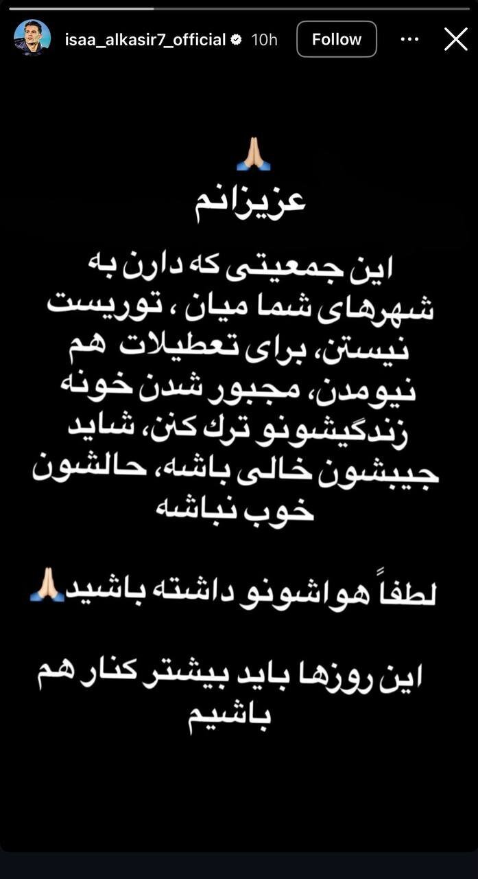 ، عیسی آل کثیر بازیکن تیم فوتبال پرسپولیس در استوری صفحه شخصی خود در اینستاگرام، پیامی منتشر شده که خطاب به شهروندان شهرهای مختلف است که این روزها میزبان مسافرانی از شهرهای جنگ زده کشور به حساب میآیند.