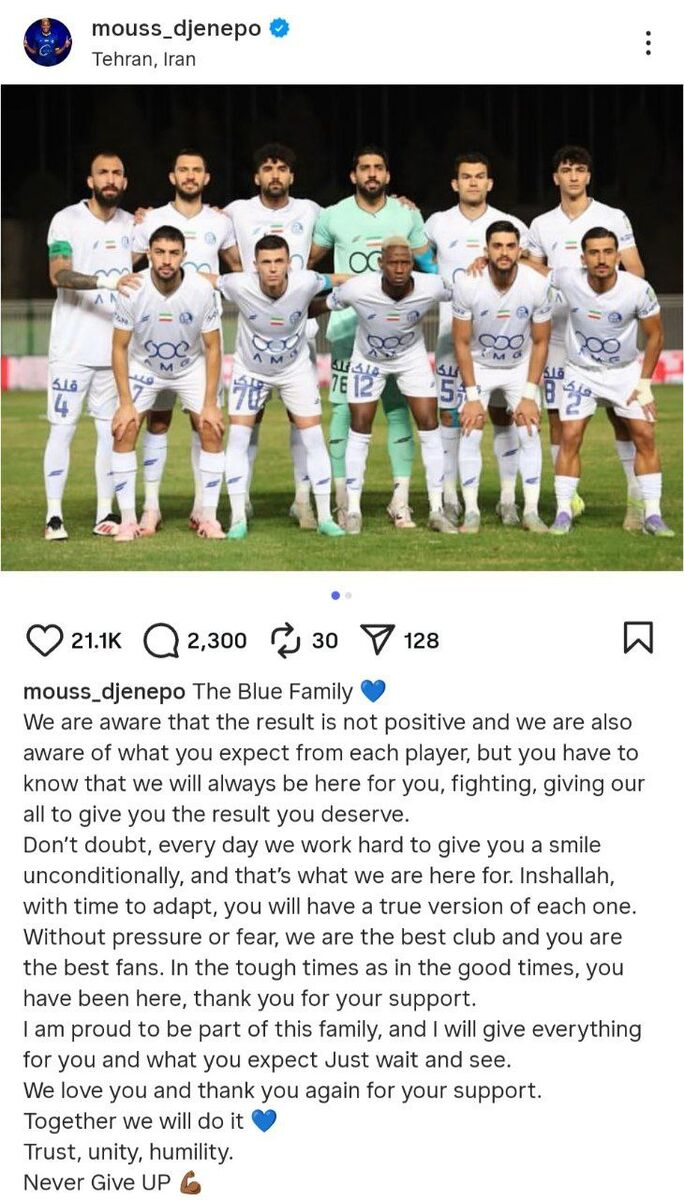 موسی جنپو، هافبک خارجی استقلال، پس از عملکرد ضعیف تیم در بازیهای اخیر و افزایش انتقادات هواداران، با انتشار پیامی احساسی در صفحه خود، به دنبال دلجویی از آبیپوشان برآمد.