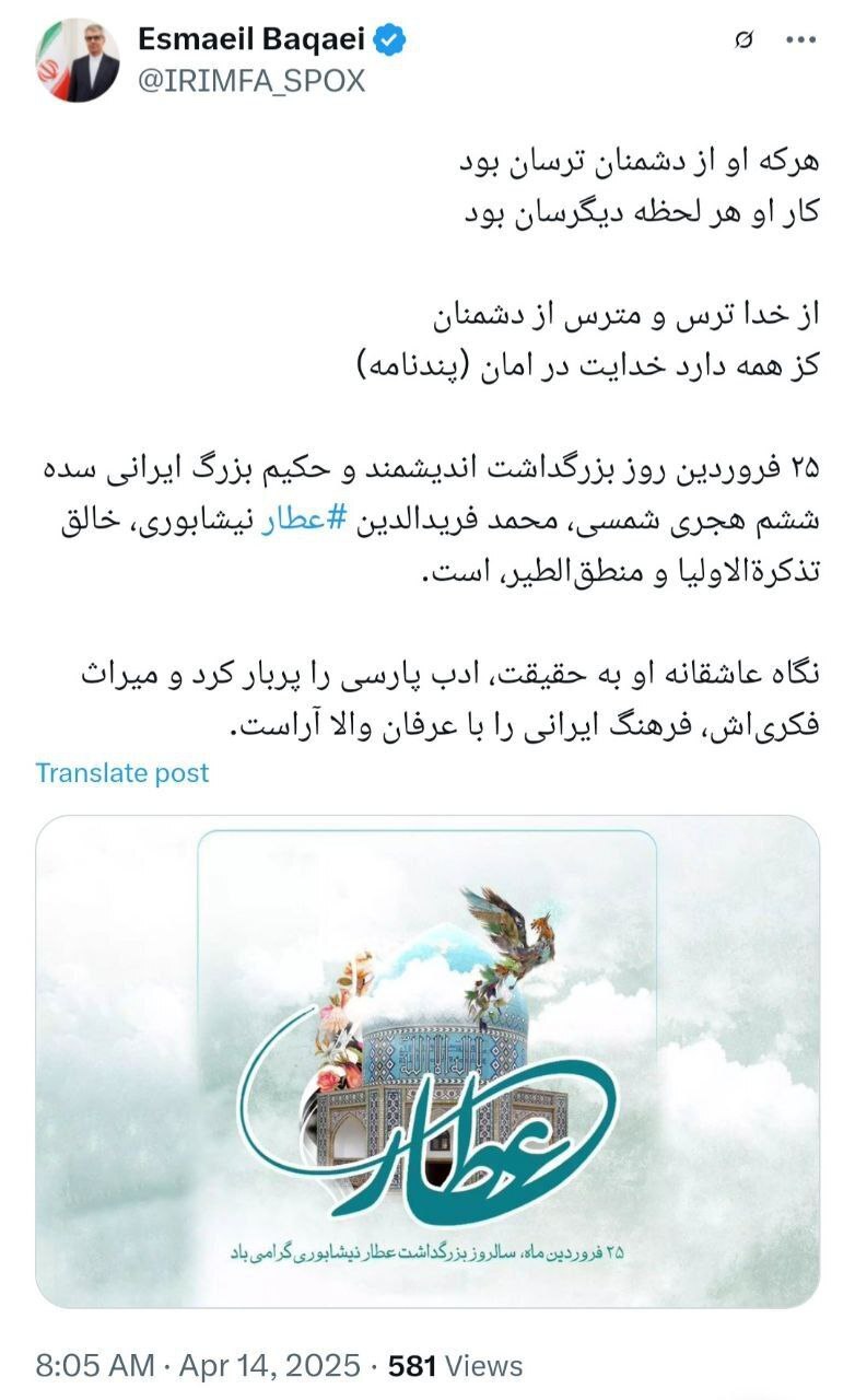 سخنگوی وزارت امور خارجه به مناسبت روز بزرگداشت عطار نیشابوری، پستی در شبکه ایکس منتشر کرد.