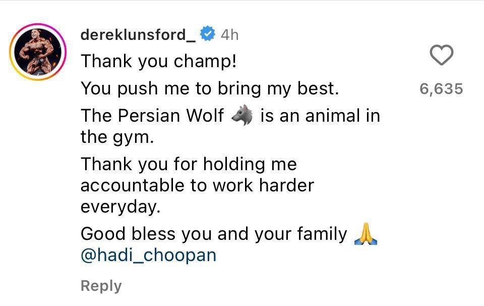🔹 درک لانسفورد دیروز در پیج هادی چوپان کامنتی با این شرح گذاشت و از او تشکر کرد: «ممنون قهرمان! تو من را به جلو هول دادی تا بهترین خودم باشم. گرگ ایرانی مرسی برای اینکه باعث شدی تا هر روز سخت کار کنم، خدا خودت و خانواده ات را حفظ کند.»
