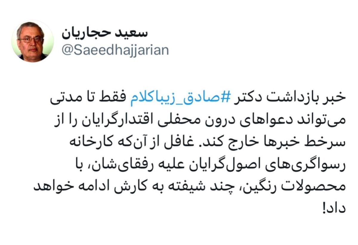 🔹خبر بازداشت دکتر صادق زیباکلام فقط تا مدتی میتواند دعواهای درون محفلی اقتدارگرایان را از سرخط خبرها خارج کند. غافل از آنکه کارخانه رسواگریهای اصولگرایان علیه رفقایشان، با محصولات رنگین، چند شیفته به کارش ادامه خواهد داد!
