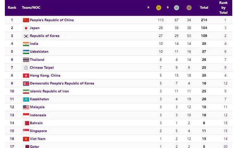 کاروان ایران بعد از کسب یک مدال نقره و یک برنز در روز هفتم بازیهای آسیایی هانگژو در جایگاه دهم جدول توزیع مدالهای بازیها قرار گرفت.