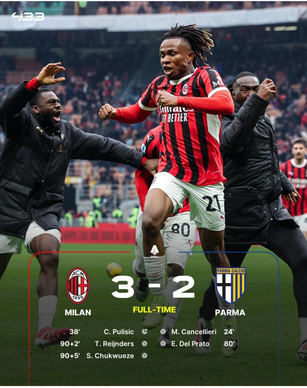 🔹در حالی که میلان تا دقیقه ۲+۹۰ در سن سیرو و با نتیجه ۲-۱ مغلوب پارما شده بود با دو گل در دقایق دوم و پنجم اضافه به بازی بازگشت و مهمان را شکست داد.