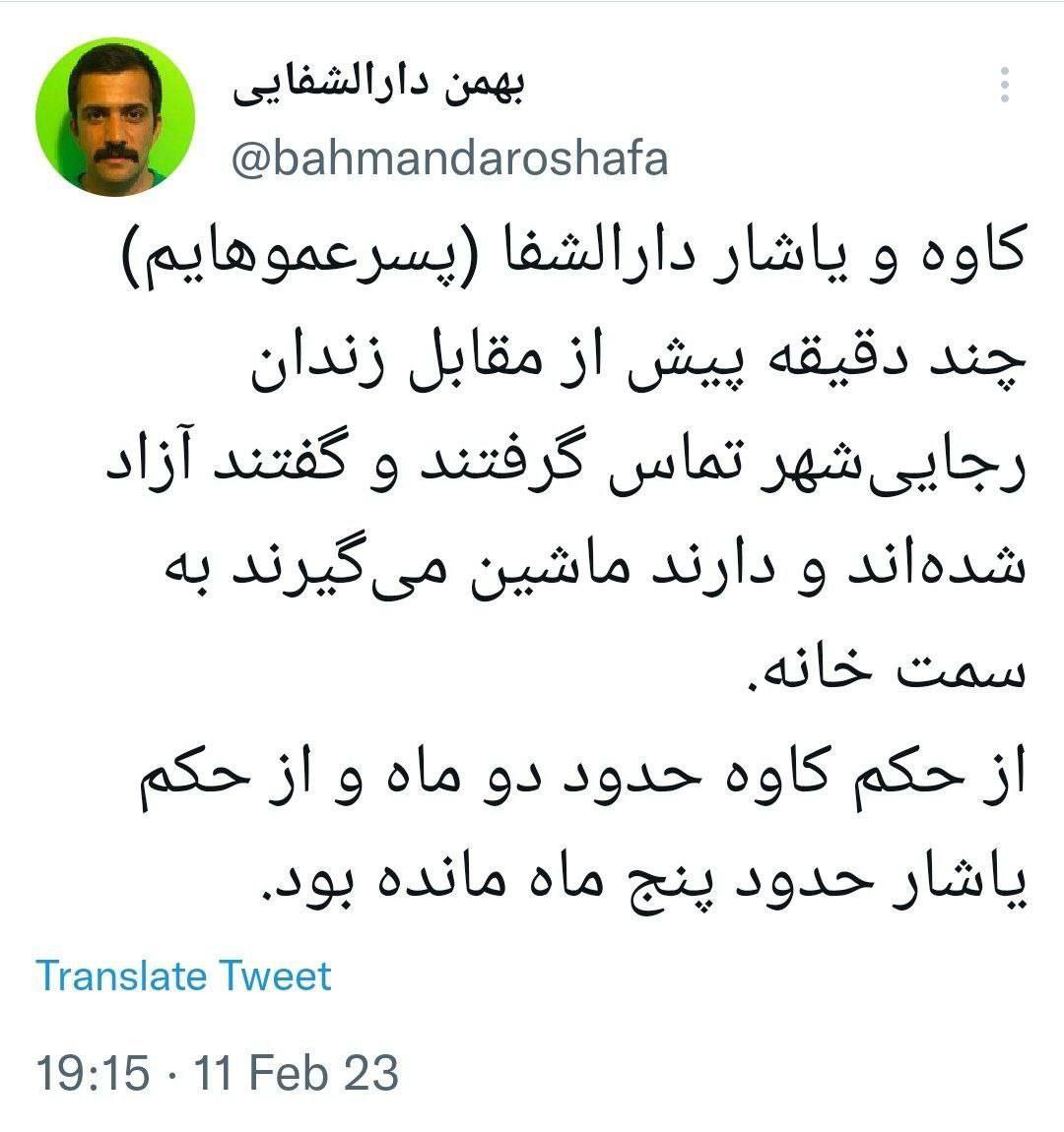 کاوه و یاشار دارالشفایی از زندان رجاییشهر آزاد شدند