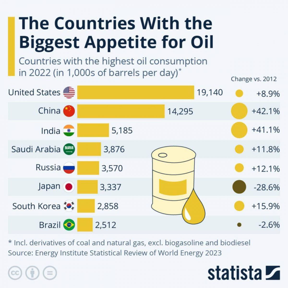 🔹آمریکا ۱۹ میلیون بشکه در روز نفت مصرف کرد و پس از آن چین، با ۱۴ میلیون بشکه در روز قرار داشت.