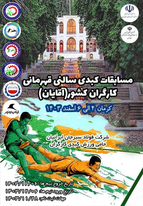 مسابقات کبدی قهرمانی کارگران کشور طی روزهای 4 الی 6 اسفند ماه جاری با حضور هشت تیم برتر کارگری کشور در شهر کرمان برگزار خواهد شد.