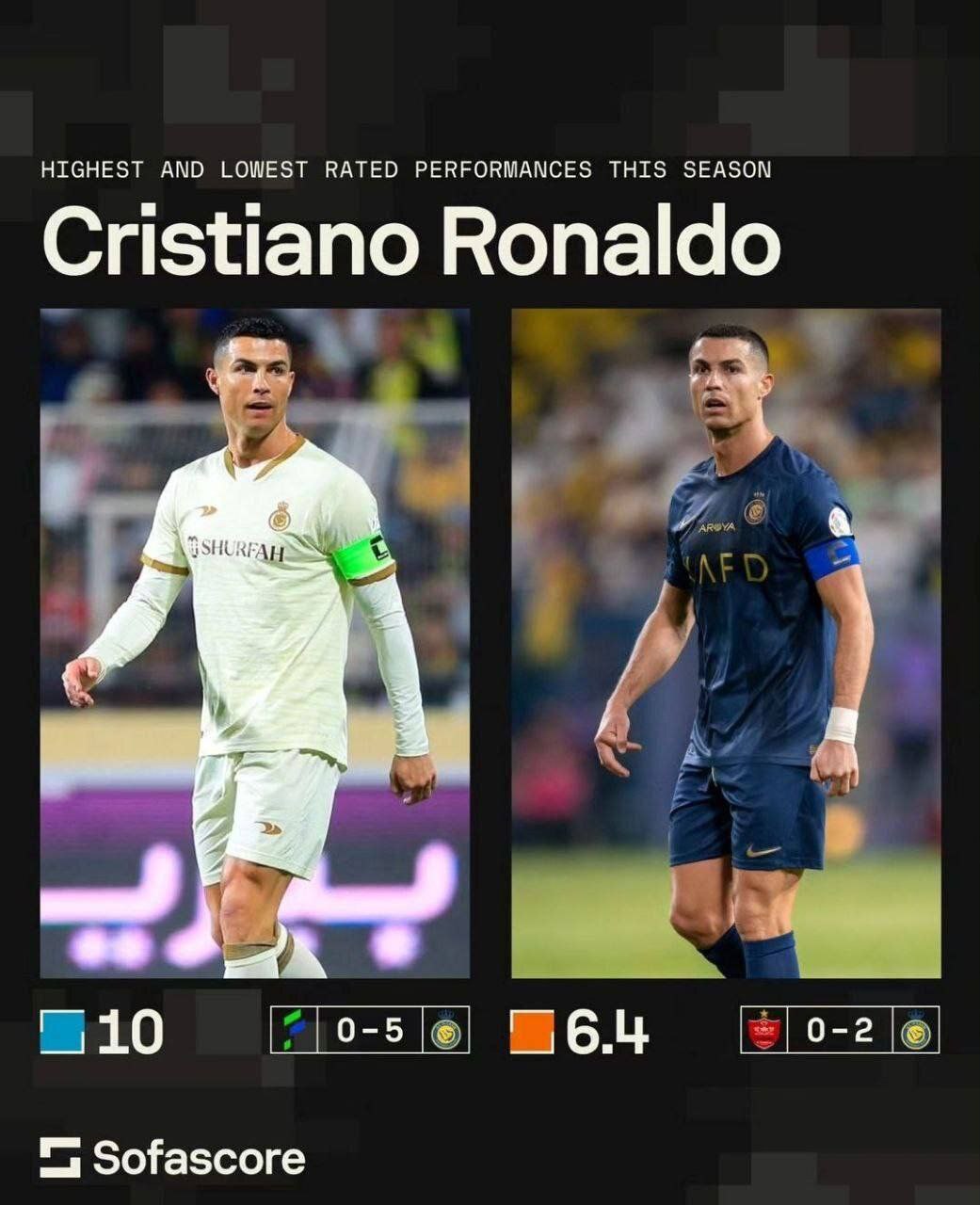 🔹نکته جالب اینکه از نگاه سوفا اسکور، ضعیفترین عملکرد رونالدو در سال ۲۰۲۳ در دور رفت مرحله گروهی لیگ قهرمانان آسیا و در ورزشگاه آزادی، مقابل پرسپولیس رقم خورد. او در پایان بازی نمره ۶.۴ را دریافت کرد.