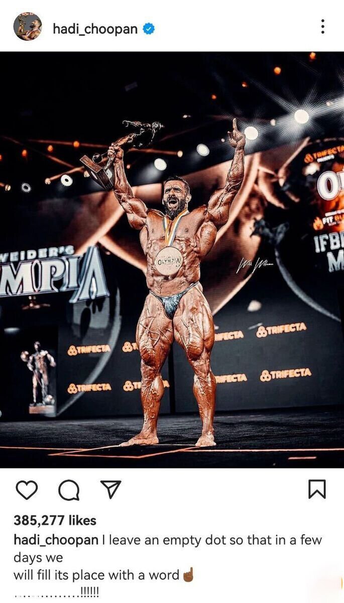 🔹کمتر از یک هفته مانده تا پیش داوری مستر المپیا ۲۰۲۳، هادی چوپان بدنساز ایرانی دسته اوپن، با انتشار تصویری از قهرمانی سال گذشته خود در این مسابقات، واکنشی به اتفاقات روزهای گذشته داشت و برای رقبای خود رجزخوانی کرد.