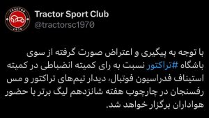 ، و به نقل از رسانه باشگاه تراکتور، دیدار این تیم برابر مس رفسنجان در هفته شانزدهم لیگ برتر که قرار بود بدون تماشاگر برگزار شود، پس از شکایت تراکتور نسبت به رأی کمیته انضباطی در کمیته استیناف، با حضور هواداران برگزار خواهد شد.