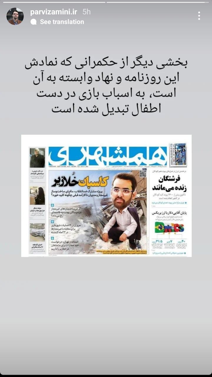 کنایه پرویز امینی به روزنامه همشهری: بخشی از حکمرانی به اسباببازی در دست اطفال تبدیل شده است