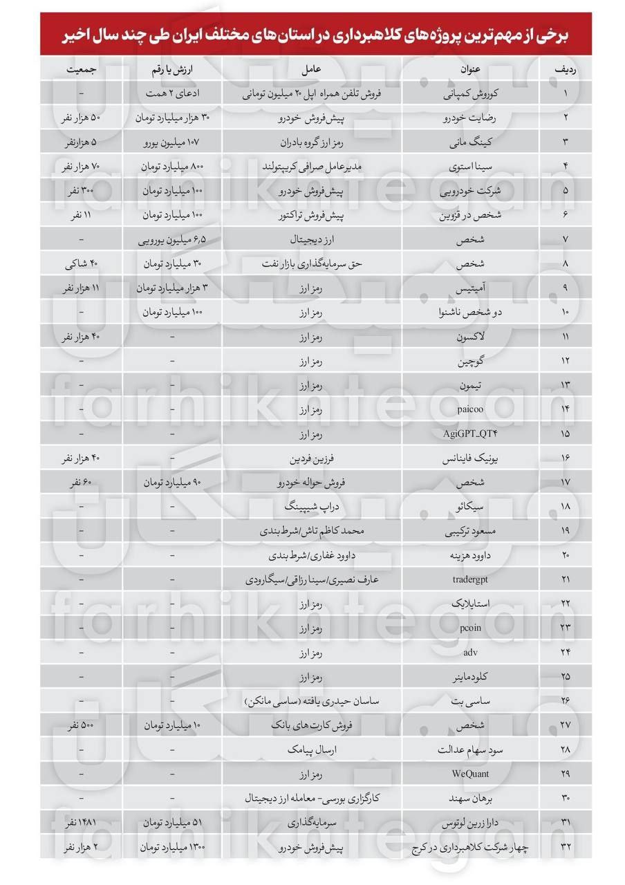🔹 در چند سال اخیر حداقل ۳۲ مورد کلاهبرداری هرکدام با بیش از چند هزار مالباخته در کشور رخ داده و جدول بالا نام شرکتها و اشخاصی است که در چند سال اخیر با شیوه کلاهبرداری پانزی فعالیت داشتهاند.