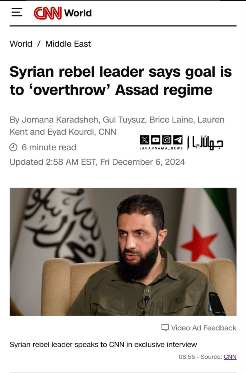 🔹ابومحمد الجولانی رهبر گروه تروریستی تحریر الشام در گفتوگویی اختصاصی با سیانان گفته «هدف نهایی ما سرنگونی دولت بشار اسد است»
