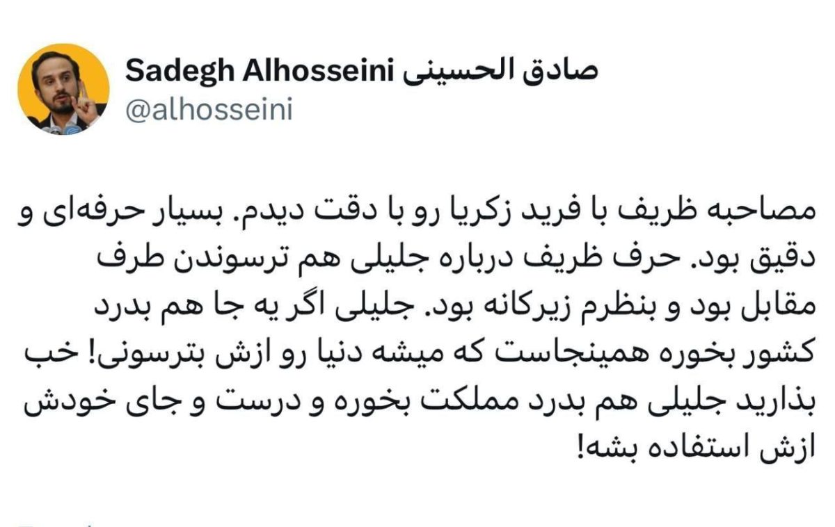 🔹ارزیابی توییتری صادق الحسینی، فعال اقتصادی، از اظهارات محمدجواد ظریف درباره سعید جلیلی در نشست داووس