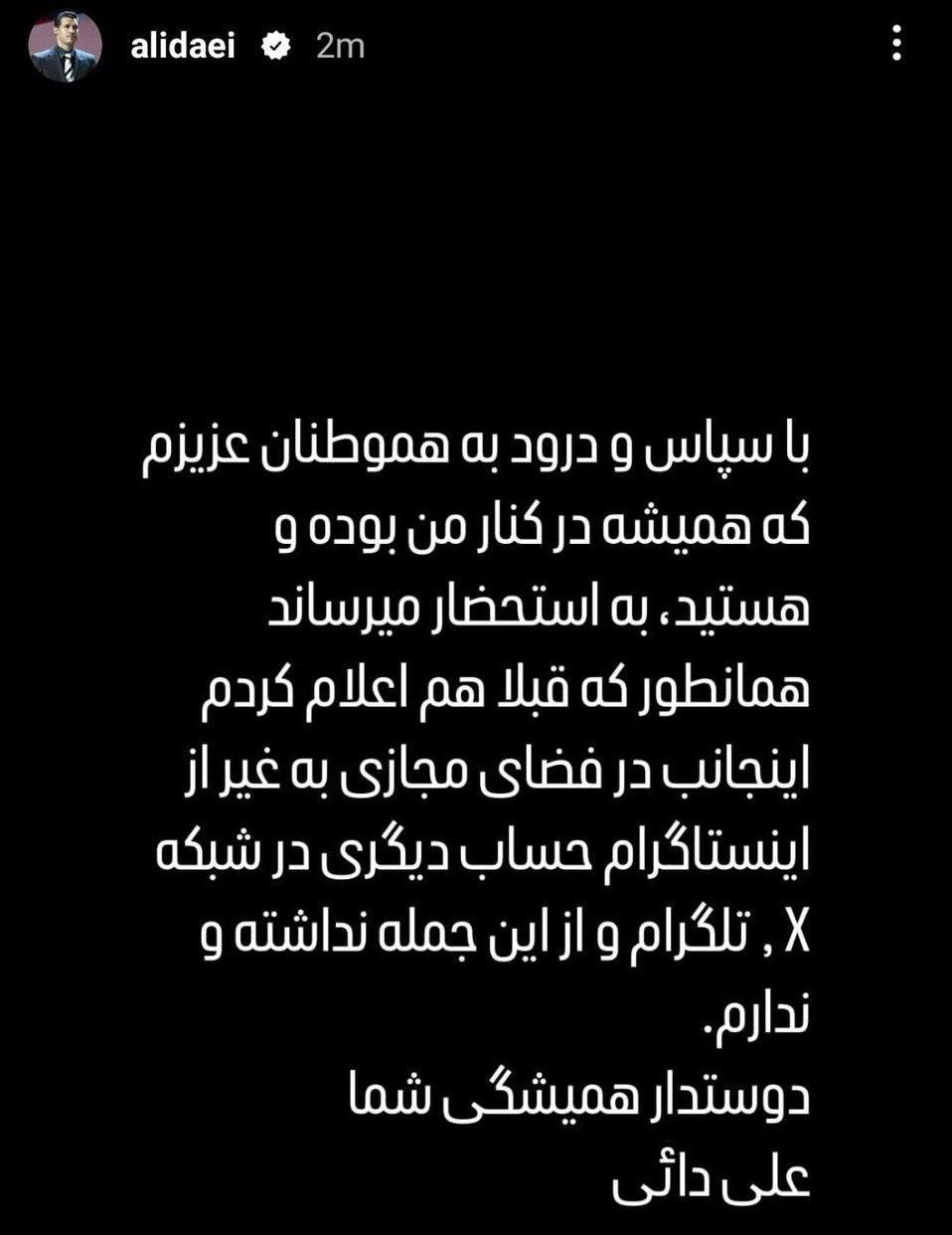 🔹استوری علیدایی: بنده هیچ حسابی در شبکه اجتماعی X(توییتر) و تلگرام ندارم