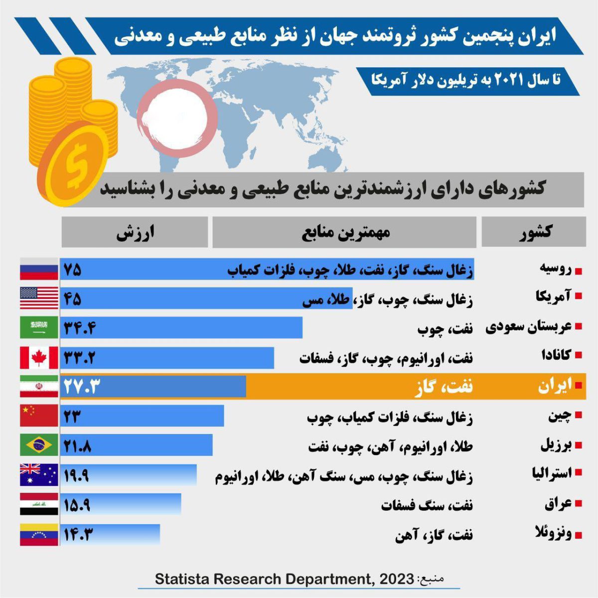 🔹ایران پنجمین کشور ثروتمند جهان از نظر منابع طبیعی و معدنی