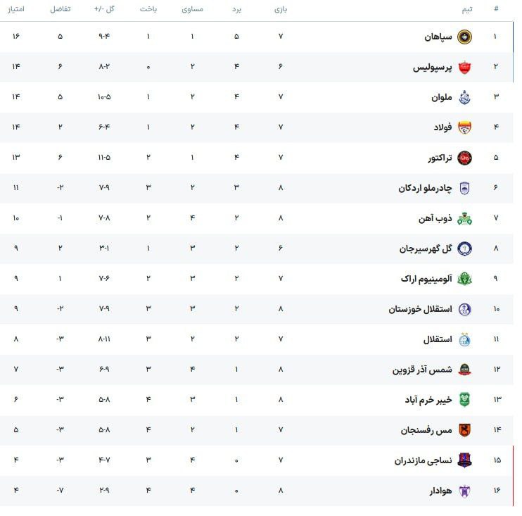🔹جدول لیگ برتر پس از پایان مسابقات روز دوم از هفته هشتم