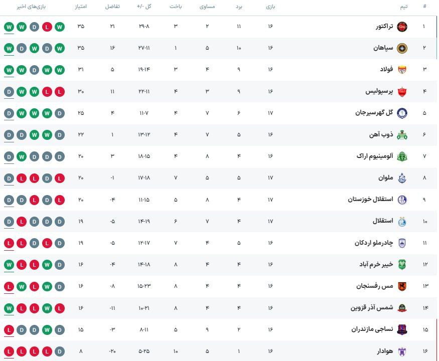 🔹جدول لیگ برتر پس از پایان مسابقات روز اول از هفته هفدهم لیگ برتر