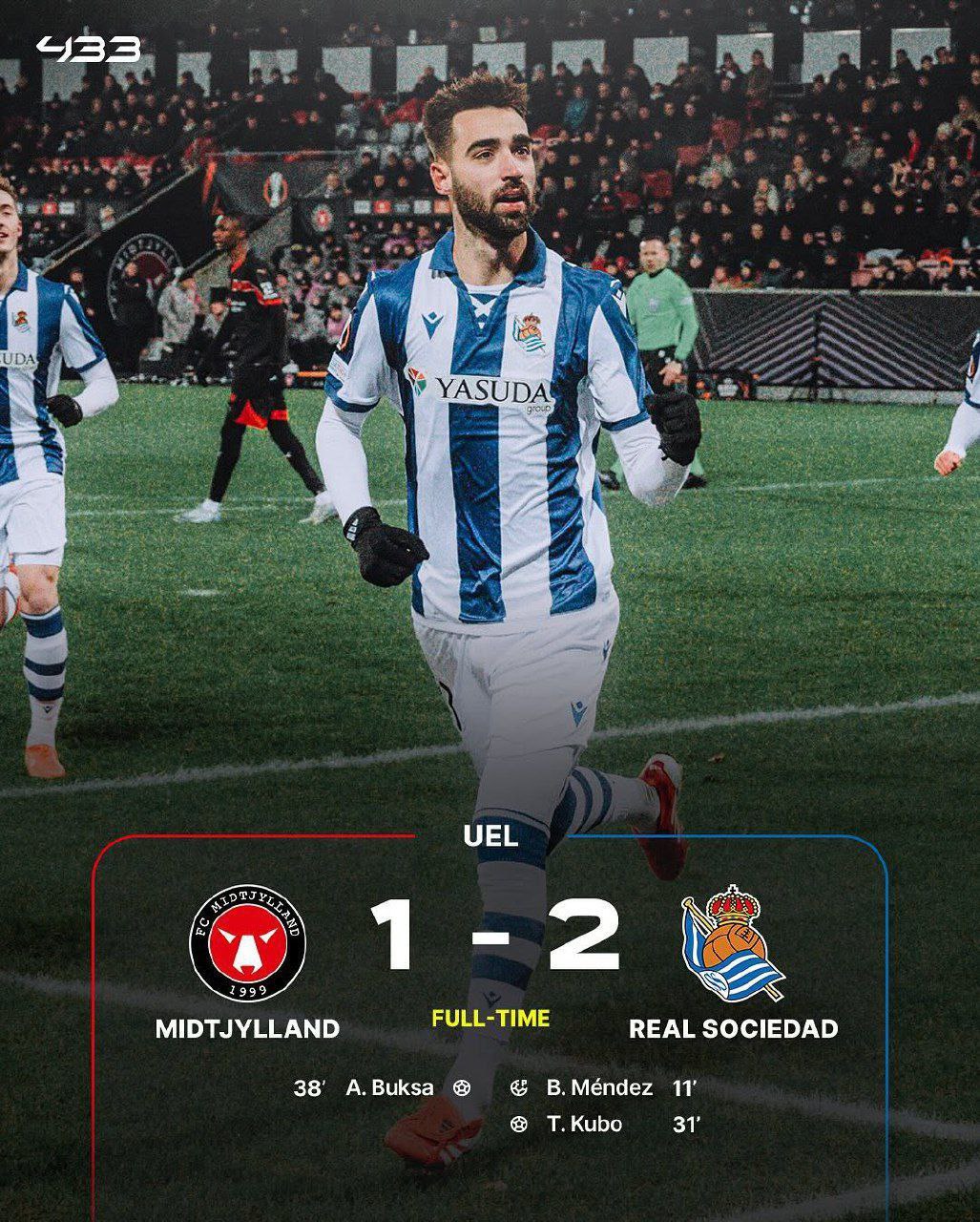 🔹رئال سوسیداد هم دیگر مهمان پیروز پنج شنبه شب بود. این تیم در دانمارک مقابل میتیلند به برتری رسید.