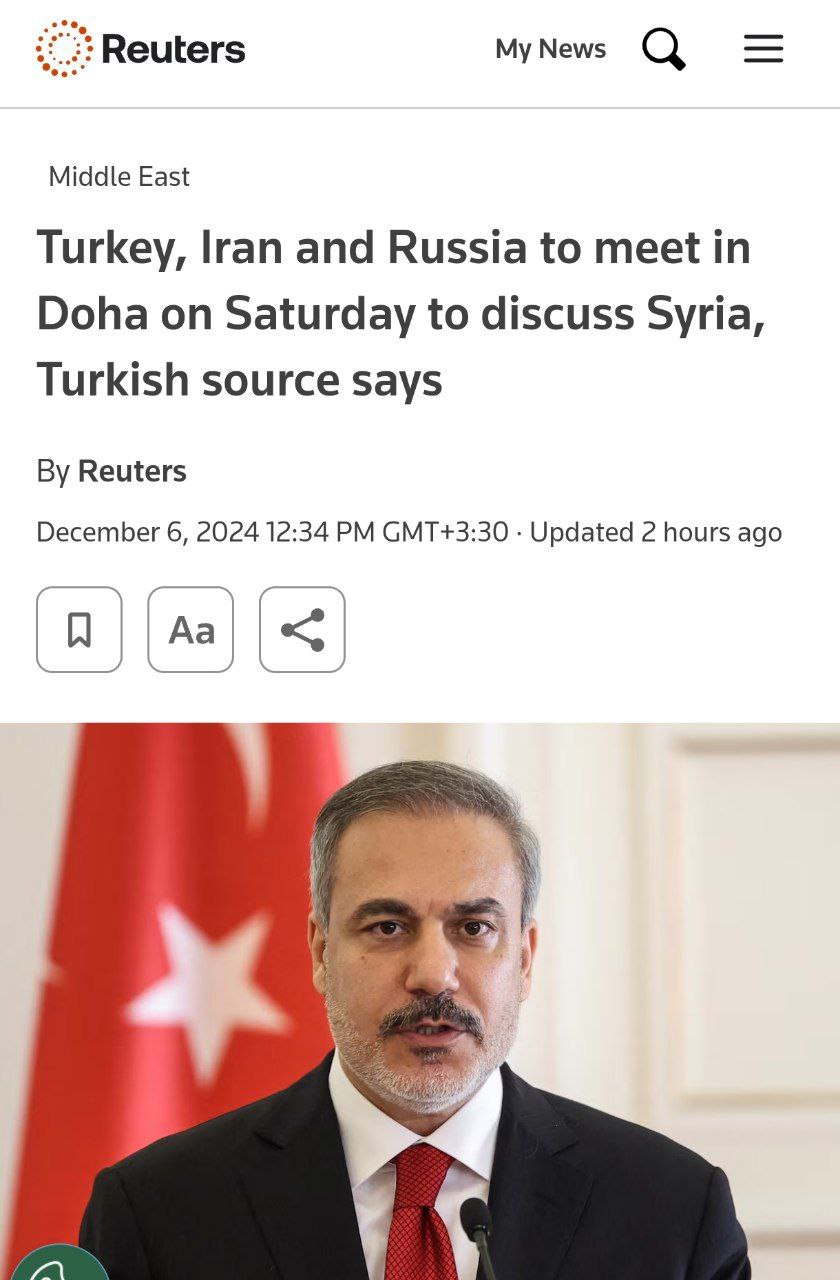 🔹رویترز به نقل از یک منبع ترکیه ای مدعی شد نشست وزرای خارجه ترکیه، ایران و روسیه برای بررسی تحولات سوریه، فردا در دوحه برگزار می شود.