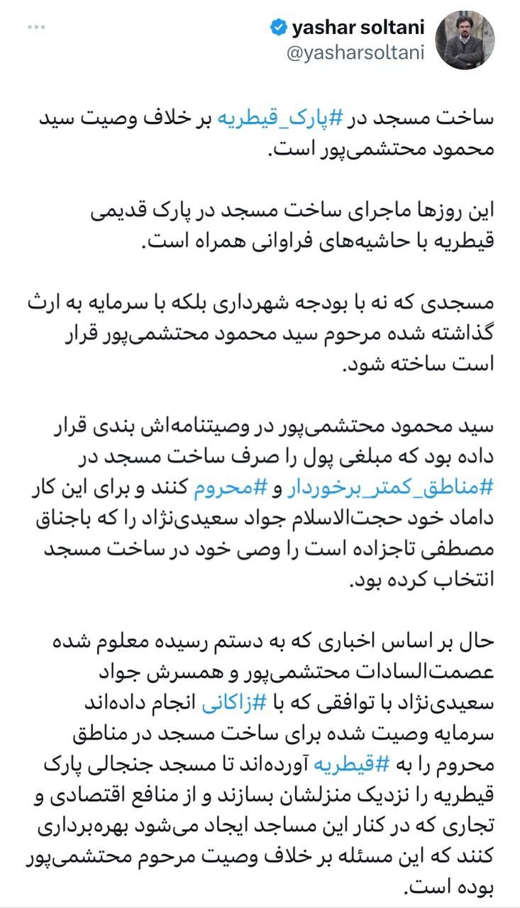 🔹ساخت مسجد در پارک قیطریه بر خلاف وصیت اهدا کننده آن است