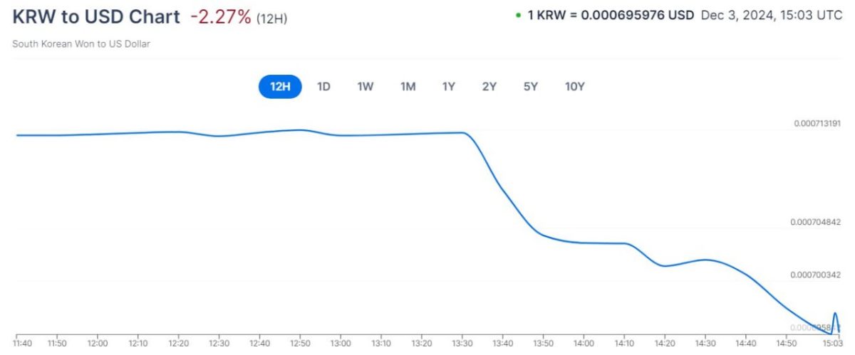 🔹سقوط ۲.۲۷ درصدی ارزش پول کرهجنوبی پس از اعلام حکومت نظامی!