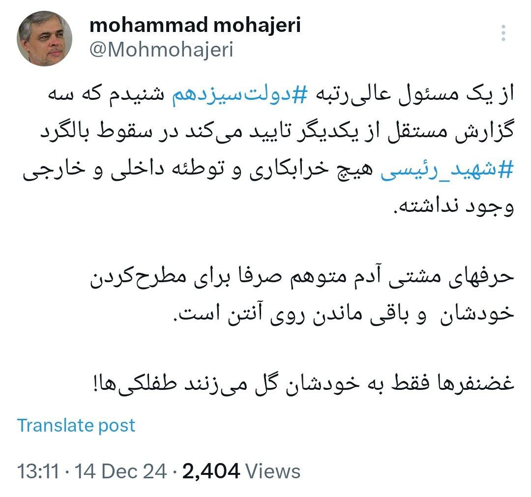 🔹محمد مهاجری: از یک مسئول عالیرتبه دولتسیزدهم شنیدم که سه گزارش مستقل از یکدیگر تایید میکند در سقوط بالگرد شهید رئیسی هیچ خرابکاری و توطئه داخلی و خارجی وجود نداشته.
