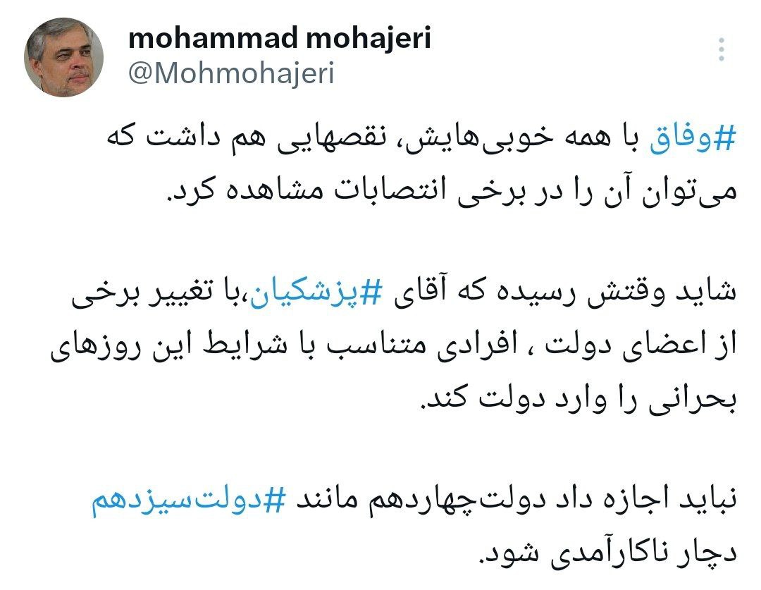 🔹محمد مهاجری: برخی انتصابات دولت نمود نقص ایده «وفاق» است!