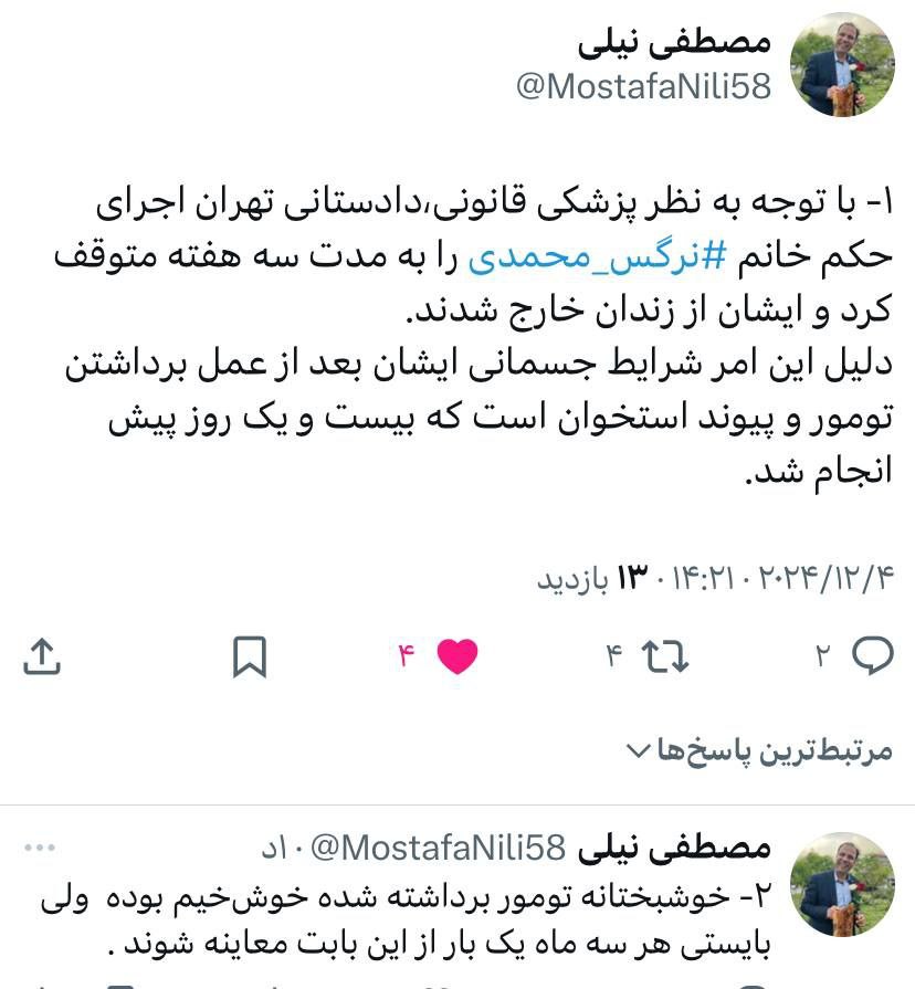 🔹نرگس محمدی برای درمان از زندان خارج شد.