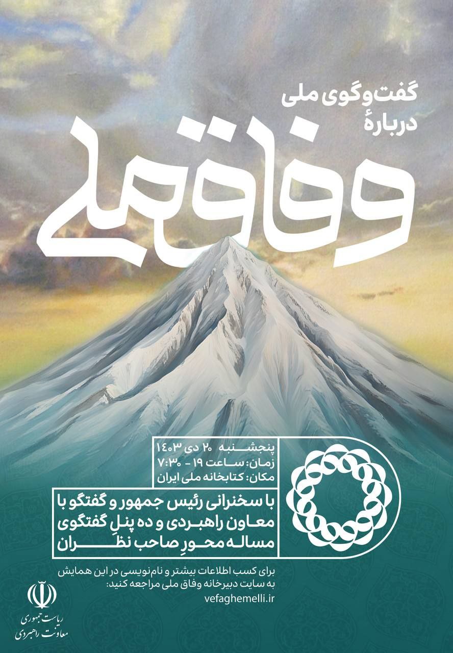 🔹همایش وفاق ملی، پنجشنبه ۲۰ دیماه ۱۴۰۳، از ساعت ۷:۳۰ الی ۱۹، در کتابخانه ملی
