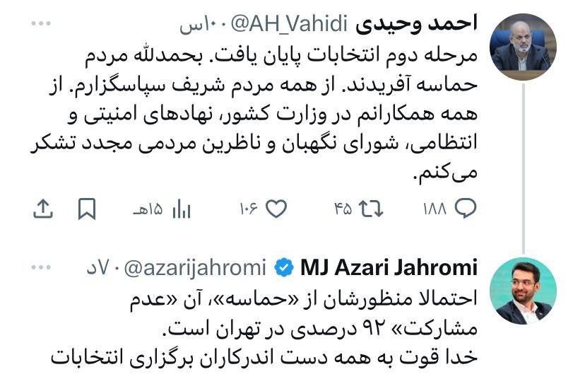 🔹واکنش آذری جهرمی به توییت احمد وحیدی