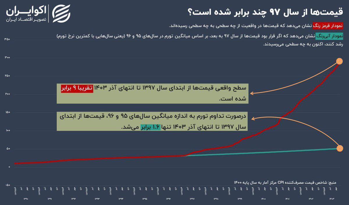🔹کمترین تورم ۱۴ سال اخیر مربوط به سالهای ۹۵ و ۹۶ یعنی دوره برجام بوده. اگر تورم با همان سرعت ادامه داشت طی سالهای ۹۷ تاکنون قیمتها فقط ۱.۶ برابر رشد میکرد نه ۹ برابر.