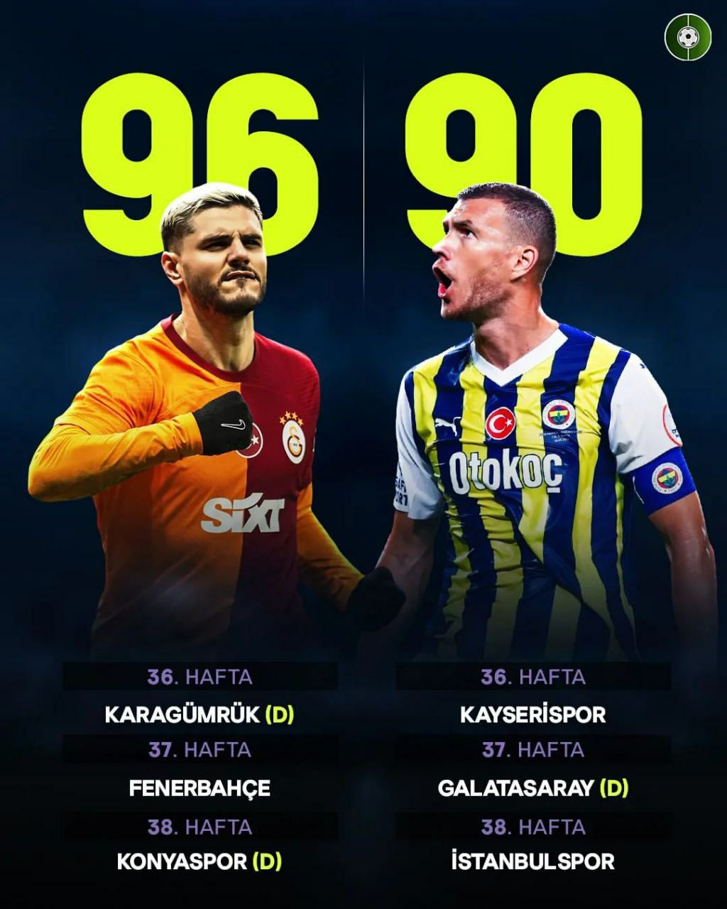 🔹کورس قهرمانی سوپرلیگ ترکیه ادامه دارد. گالاتاسرای با کسب ۴ امتیاز از سه بازی پیش رو میتواند قهرمانی خود را جشن بگیرد.