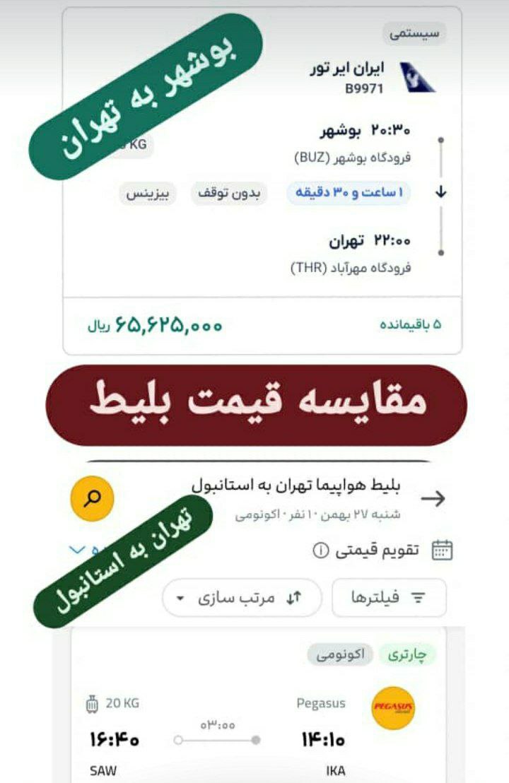 🔹گرانی بلیط ها و مقایسه بلیط پرواز داخلی بوشهر به تهران و پرواز خارجی تهران به استانبول